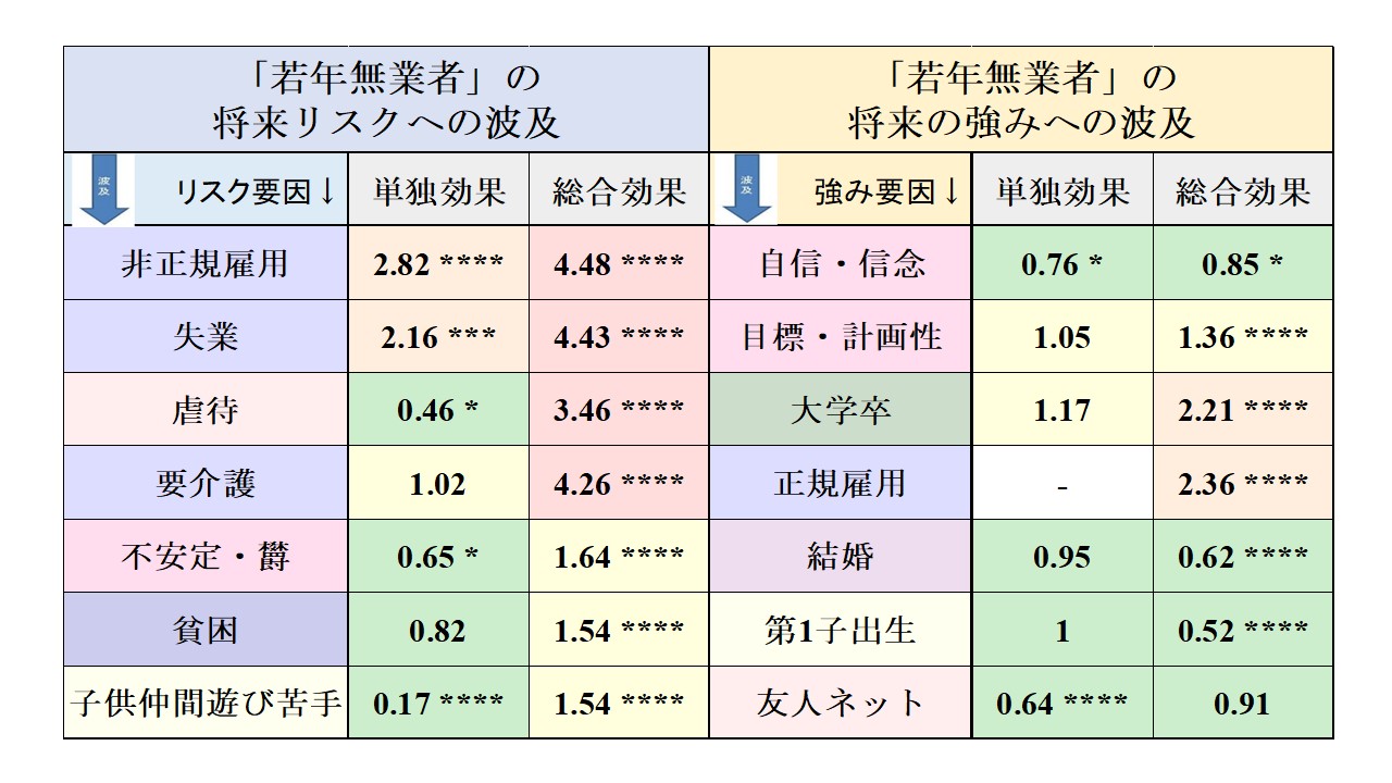 | Summary: 「若年無業者」になった人は、その後、どのようなリスクを抱えることになるのでしょうか?上表で若者世代の総合効果で見ると、将来、予想されるリスクは「非正規雇用」、「引きこもりがち」、「人生無意味」の3つです。これは親の世代である団塊ジュニア世代の若者が抱えていたリスクよりも改善しているものが多く、特に「貧困」のリスクが「若年無業者」の方が将来のリスクが低下する予測となっているなど、明るい面も見えています。 | |||