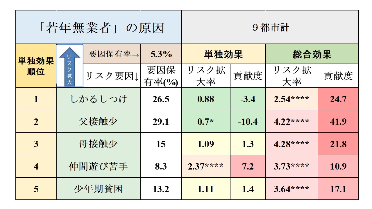 Summary: 「若年無業者」になる原因を、最初のきっかけとなった原因だけを取り出した影響度(単独効果)、及び、それが他のリスクに波及しそれらの影響も含めた影響度(総合効果)の2つの方法で計測しています。 単独効果で見ると、幼児期の社会性発達の遅れの指標で、発達障害の共通の初期症状でもある「仲間遊び苦手」が「若年無業者」のリスクを7.2%ポイントも拡大し第1位となっています。 総合効果で見ると「父接触少」が第1位で「若年無業者」になるリスクを41.9%ポイント拡大し、ほかにも「しかるしつけ」、「母接触少」等いずれも幼少期の社会性発達に関連したリスク要因が大きく関係していることが分かりました。 | |||
