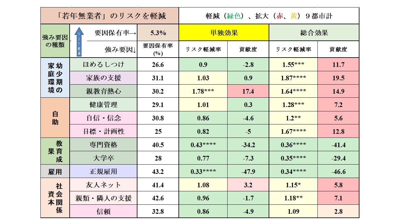 | Summary: 次に「若年無業者」になるリスクを予防し、削減する強み要因の効果を見てみましょう。総合効果で見ると、「若年無業者」になるリスクを減らしているのは「専門資格」「大学卒」「正規雇用」の3つだけで、「親教育熱心」「目標・計画性」を持っているなど通常は良い結果と結びつきやすい要因も、総合効果では「若年無業者」を増やす結果となっています。これは、この調査を行った時期が就職氷河期とその後の厳しい経済情勢の時期に重なったことが大きく響いていると考えられます。 | |||