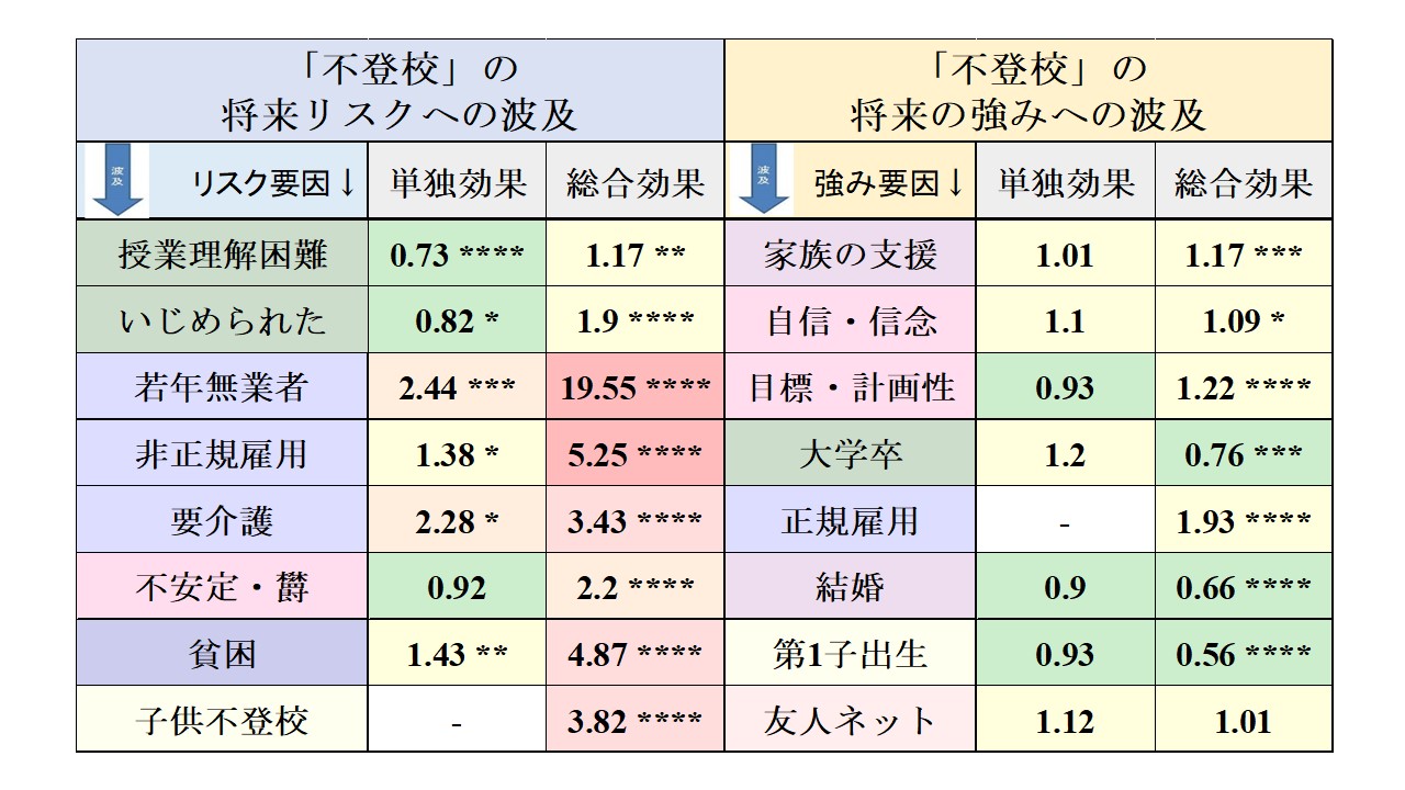 Summary: 「不登校」が若者世代で急拡大したことが、若者の将来のリスクにどのような影響を与えるかを調べるため、世代別により詳しい将来への波及を調べてみましょう。 「不登校」を経験した子は他の共変量の波及効果を取り除いた単独効果(上図右側の表)では、「高校中退」「若年無業者」を1%ポイント前後、「引きこもりがち」を2%程度増やしていますがその他のリスクにはほとんど影響がありません。 次に、共変量による波及効果も含む総合効果(左側の図)で見ると、「不登校」は、団塊ジュニア世代・若者世代共に全ての学齢期以降のリスクを増やしていますが、それらの増加寄与度は比較的小さく1%ポイントを超えるのは「高校中退」「若年無業者」「非正規雇用」「貧困」のみで、いずれも1%台に留まっています。 従って、これらのリスクのきっかけとなる「高校中退」を如何に防ぐかを考えることが重要となります。 | |||