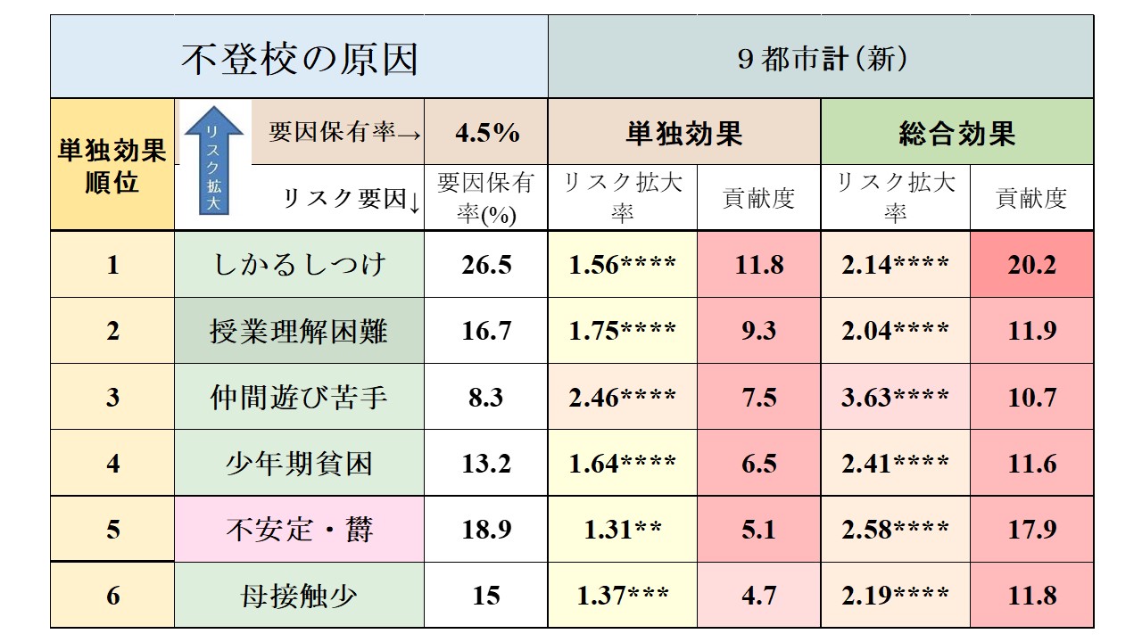 文科省の調査では、不登校」に関する「家庭関係の要因」の割合は34.4%と非常に高い比率となっている。 CCS調査では、家庭要因を重視しており、6つのリスク要因を調べているが、最も不登校を増やしているのは「しかるしつけ」であり、次いで「父接触少」「母接触少」「家庭の貧困」「虐待」などが「不登校」を大幅に増やしており、本人が抱えるリスク要因と匹敵するような不登校への貢献度を示している |