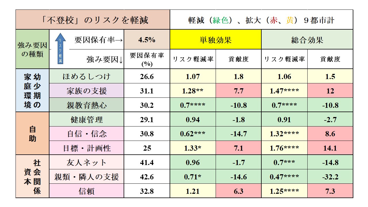 Summary: それでは、「不登校」が将来の強み要因の低下に繋がるリスクはどうでしょうか?まずこれを単独効果で見ると強みを減らしているのは自己の価値観の強みで、「自信・信念」「目標・計画性」をそれぞれ0.2%ポイント、及び1.1%ポイントと僅かに減らしています。また家族関係の強みでは「結婚」を0.7%ポイント減らしています。一方、教育成果の面では驚くべきことに「専門資格」の取得を1.5%ポイント、「大学卒」も1.5%ポイント増やしていることが明らかになりました。 しかし総合効果で見ると、「専門資格」は0.1%ポイントと僅かにプラスを保っていますが、大学卒」はマイナス1.1%ポイントと減少に転じていますが、「正規雇用」は0.1%ポイントとわずかながら増加させています。 「不登校」は、本人及びご家族にとっては大変な苦しみとなりますが、近隣との人間関係や自己の価値観を保ち、克服する道があることが示されていることは心強いことだと思います。 | |||